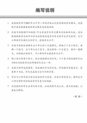 - 本练习册配合新课本五个单元的十五篇课文,精编了十五个练习,每课一个练习,五个单元五个复习,最后提供一个总复习。每学一篇课文,必做相应的练习,可以帮助学生提高华文水平。