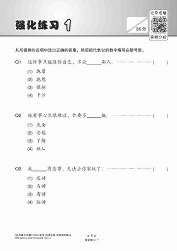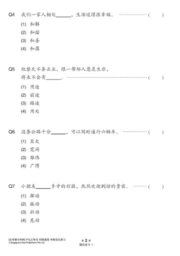 会考满分冲刺 PSLE华文词语选择考前强化练习 考查的内容,完全根据PSLE华文试卷样本的“语文应用”考试项目(Q5 – Q6) 编写,出题形式与程度,也紧扣最新的PSLE考题。