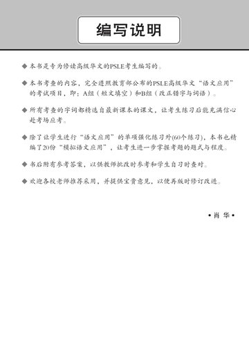 - 除了让学生进行“语文应用”的各项考试项目的强化练习外, 本书还精 编了个“模拟语文应用” 复习, 让学生进一步掌握考试的题式与程度。