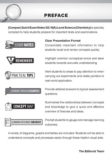 Conquer QUICK EXAM NOTES G2 / N(A) LEVEL SCIENCE (CHEMISTRY)) series is specially compiled to help students prepare for important tests and examinations.