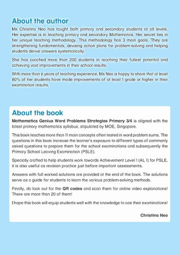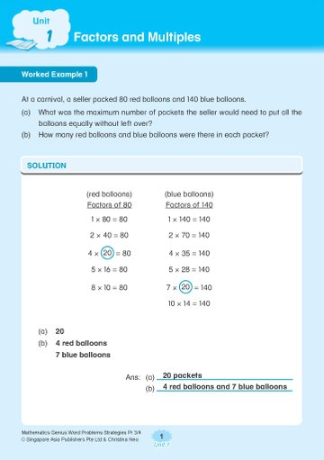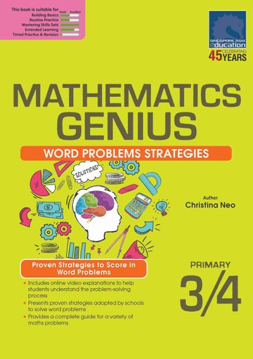 MATHEMATICS GENIUS WORD PROBLEMS STRATEGIES PRIMARY 3/4 is aligned with the latest primary mathematics syllabus, stipulated by MOE, Singapore. This book teaches more than 11 main concepts often tested in word problem sums. The questions in this book increase the learner’s exposure to different types of commonly asked questions to prepare them for the school examinations and subsequently the Primary School Leaving Examination (PSLE).