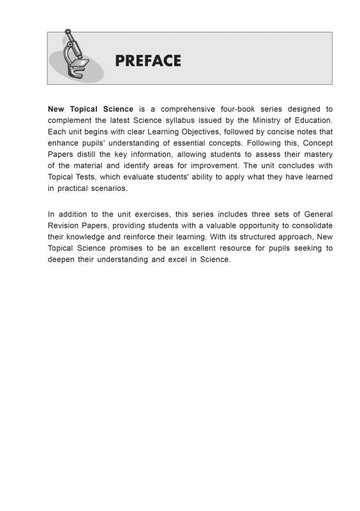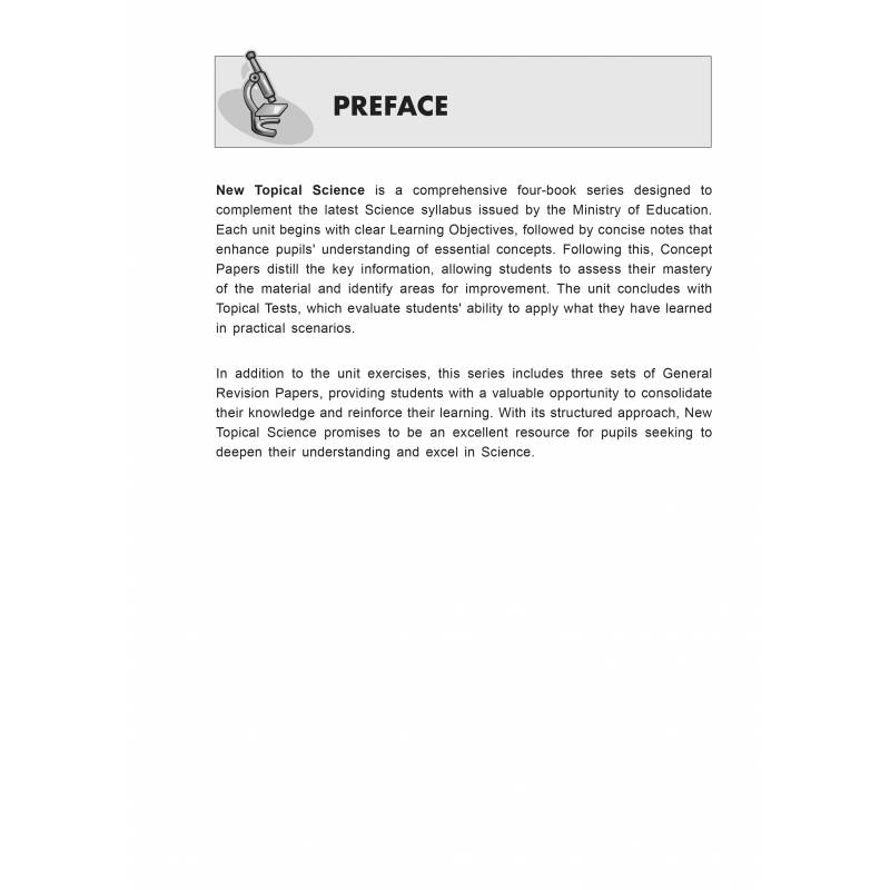 New Topical Science is a comprehensive four-book series designed to complement the latest Science syllabus issued by the Ministry of Education.